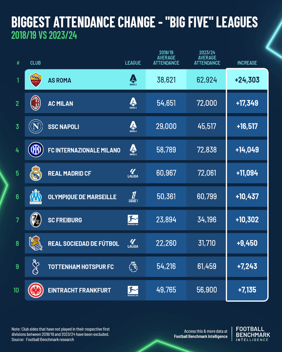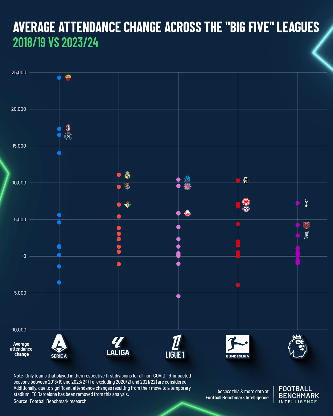 In Germany, SC Freiburg’s move to the new 34,700-seat Europa-Park Stadion unlocked latent demand previously constrained by their former ground. In a similar vein, Eintracht Frankfurt and RB Leipzig — who recorded the next largest average attendance increases in the Bundesliga — also benefited from expanded stadium capacity.