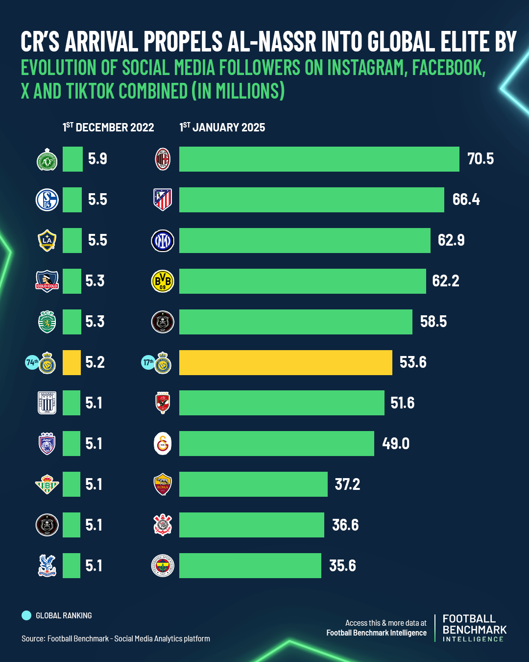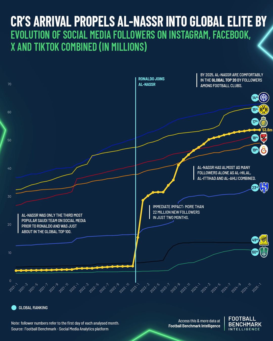 Ronaldo’s arrival had an immediate and measurable impact at the club level. Before his signing, Al-Nassr was the third most-followed club in the Saudi Pro League (SPL), trailing Al-Hilal and Al-Ittihad, and 74th globally. The club’s digital presence surged from under 5.2 million followers—on par with Real Betis (Spain) and Club Alianza Lima (Peru)—to over 57.5 million by March 2025. Al-Nassr are now the 2nd most followed club outside Europe behind Brazilian club CR Flamengo. They are now also among the global Top 20 by followership, closely accompanied by the likes of Inter Milan, Borussia Dortmund or AS Roma, signalling how far they have come in terms of visibility and popularity.