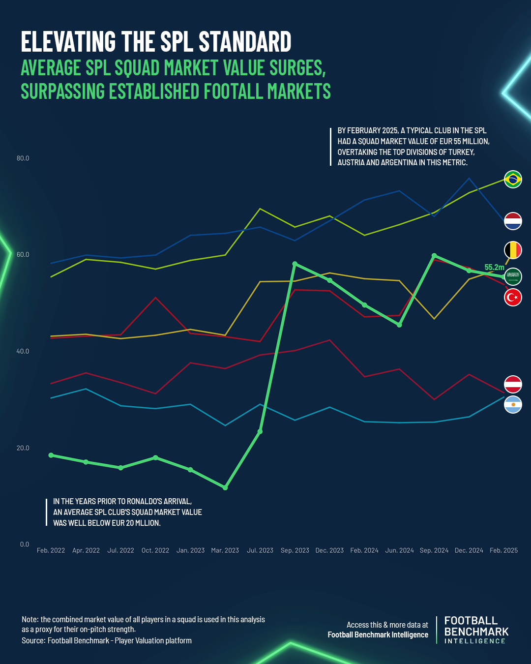 This wave of investment also significantly increased the SPL’s competitiveness. Prior to Ronaldo’s move, the average market value of Saudi first division squads, based on Football Benchmark's proprietary player valuation methodology, was well below EUR 20 million — comparable to leagues such as Serbia, Romania or South Korea. By the end of the 2023 summer transfer window, the average squad value had nearly tripled to EUR 60 million, surpassing markets such as Argentina and mid-tier European competitions like Austria and Belgium and placing the SPL just above the Turkish Süper Lig in global rankings, as well. Since 2023, the SPL has been able to retain a similarly high average squad value.