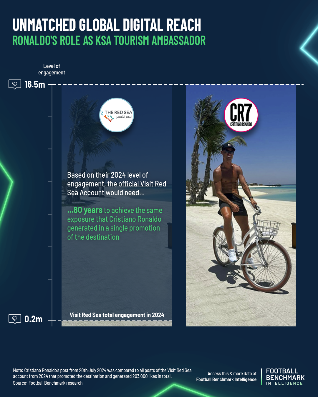 This dynamic is particularly evident in social media engagement metrics. When, in July 2024, Cristiano Ronaldo shared a post about his family trip to the Red Sea, it garnered over 16 million likes on Instagram. Based on its 2024 level of engagement, the official VisitRedSea account, which promotes one of Saudi Arabia’s flagship tourism developments and a key component of the country’s broader tourism strategy, would need 80 years to achieve the same level of exposure that Ronaldo generated in a single promotion of the tourism destination.
